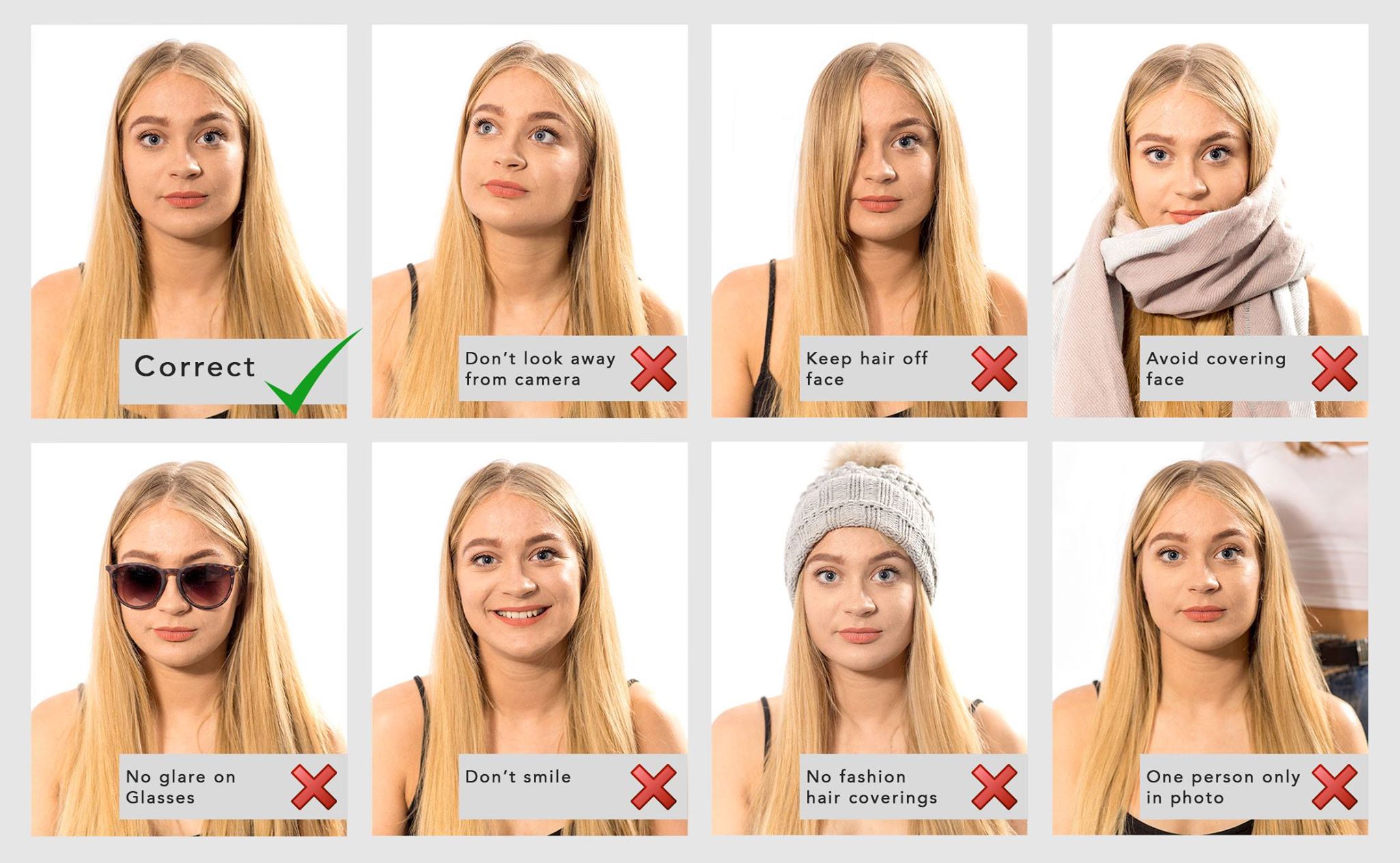 Do not wear sunglasses or tinted glasses, if you wear glasses that you cannot take off, your eyes must be visible without any glare or reflections.